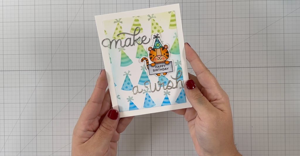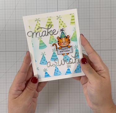 Finally, all of my elements come together as I work with a piece of 80-pound Nina Classic Crest Solar White. I will take my ink-blended panel featuring those adorable Pretty Pink Posh party hats and carefully glue it down, centering it as best as I can. Next, I’ll use the “Make a Wish” die cut, positioning “Make” above our tiger and “Wish” below to create a playful design that flows seamlessly. I'm employing the My Sweet Petunia Glue Press along with my favorite Barely Arts glue to stick all the elements together. I realized I wanted to keep the card simpler, so I decided to set aside the presents for another project. Once my panel is assembled, I will use the same glue to attach it to my card base, which will be crafted from the 110-pound version of Nina Solar White Classic Crest.
