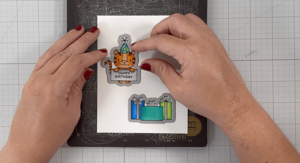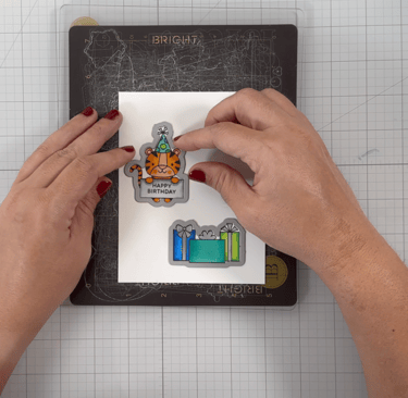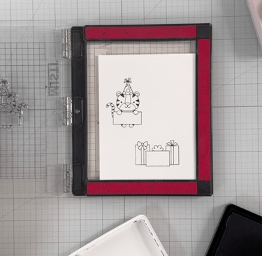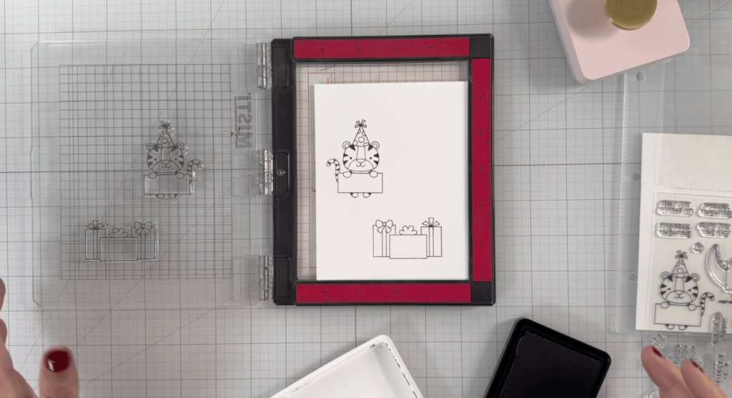 It's essential to choose an ink that is friendly with alcohol markers to prevent any bleeding while coloring. For today’s card, I'm using Honey Bee Stamps' Intense Black ink. I plan to stamp my images at least two or three times to achieve a crisp impression. To assist with this, I'm making use of my Pinkfresh Studio stamp press. Isn't this tiger wearing a party hat just the cutest? Don’t forget to include a sentiment on his sign; I opted for "Happy Birthday."