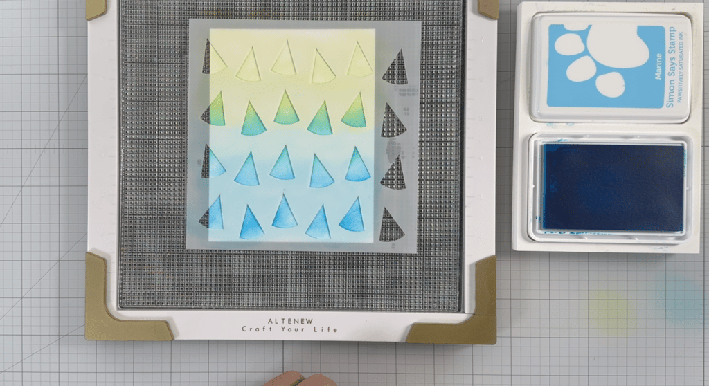 I also had the idea to take my ink-blended panel and use a die cut to create a scalloped edge. However, what I thought would keep the panel whole ended up merely cutting the scalloped edge as an additional layer. This was a mistake I decided not to pursue, so I simply kept the trimmed-down panel and went in that direction. Mistakes are part of the crafting journey; after all, it’s just paper. You do your best and move forward!